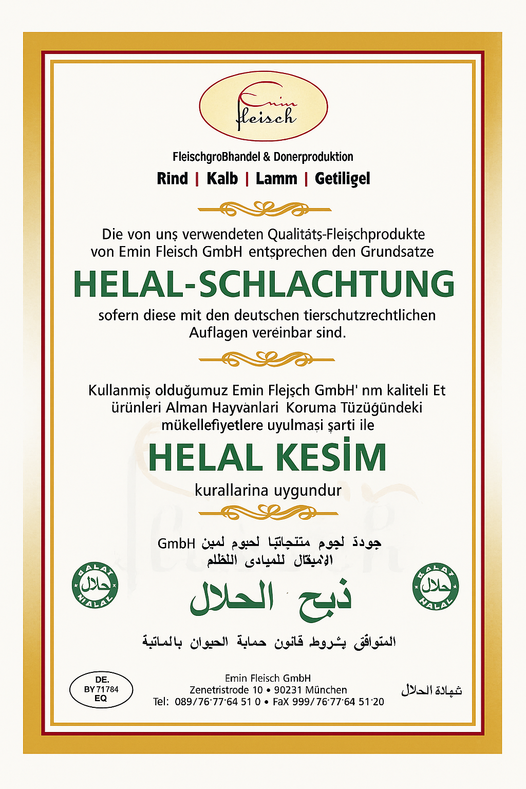 Unsere Corndogs werden mit Putenfleisch zubereitet und sind halal. Das entsprechende Zertifikat stellen wir euch hier zur Verfügung.: Zertifikat